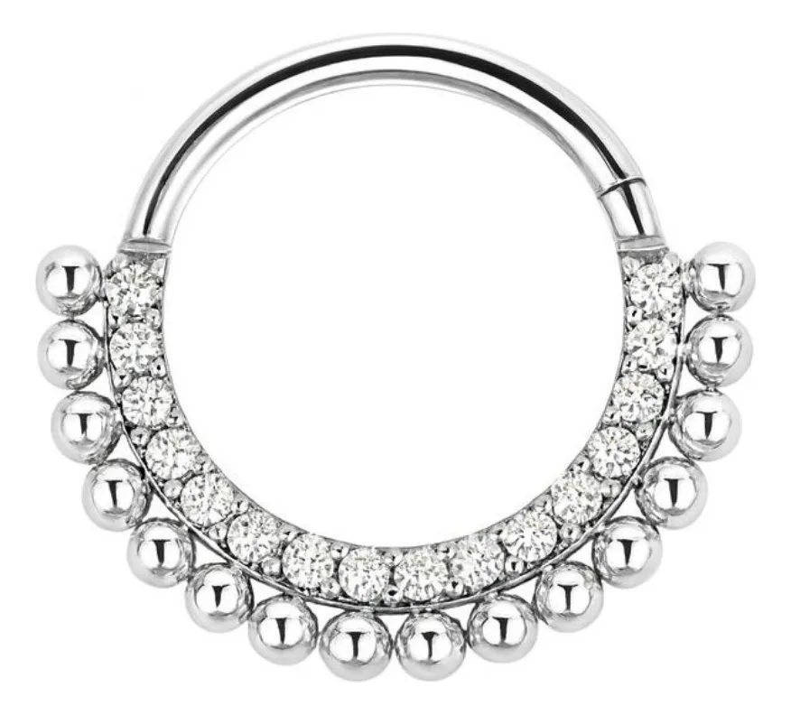 Piercing tipo Daith de Titanio  (cumple con la norma de grado implantable), con Circonitas blancas y detalles metálicos. Es comodo